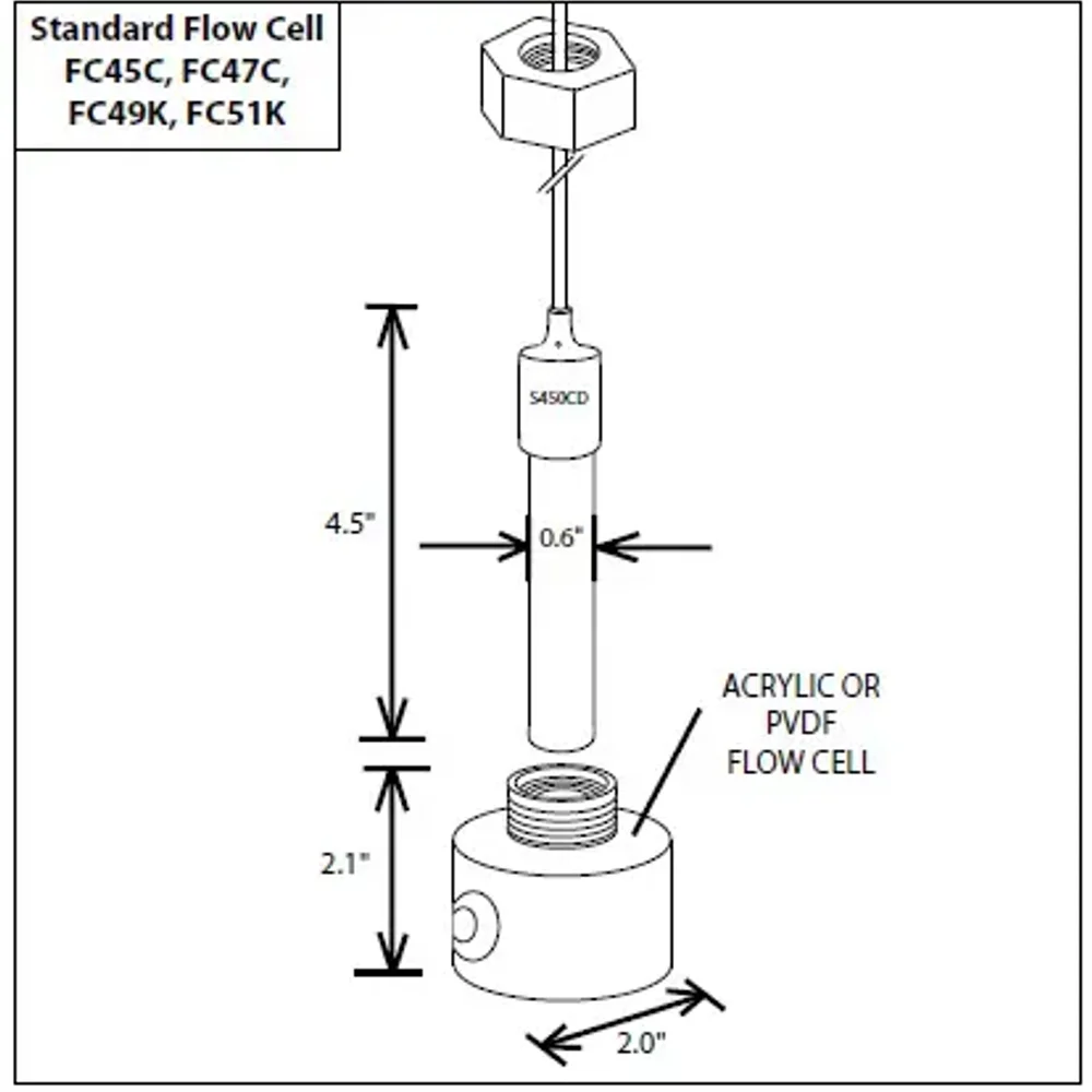 Use with our model 450CD flat electrode. Very low internal volumes are achieved by using a flat surface pH electrode located at the top of the flow cavity. The resulting rectangular cross-section flow path has no protruding parts which could interfere with a clean sweeping flow. The result of this design is the fast system response needed for rapid detection.